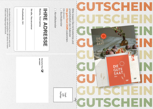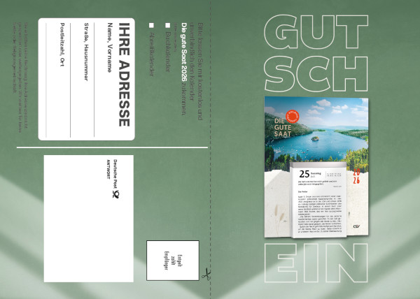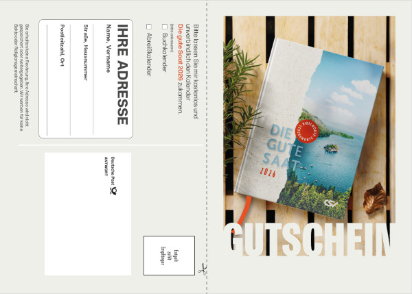 Sie möchten den Gute-Saat-Kalender den Menschen in Ihrer Umgebung kostenlos zukommen lassen? Dann könnten Sie unsere Gute-Saat-Gutscheine verteilen (Faltkarte in Postkartengröße mit Leseprobe). Hier können Sie sich in nur wenigen Schritten einen personalisierten Gutschein generieren und drucken lassen.